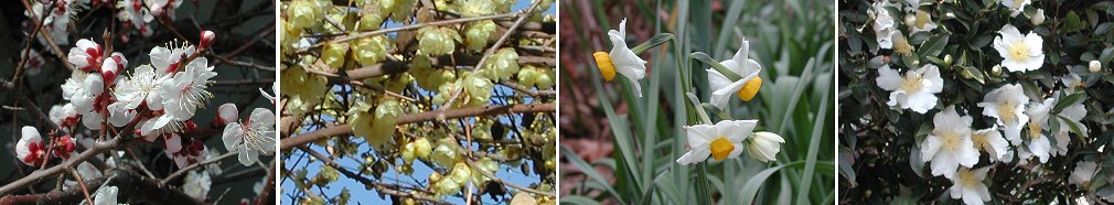 お天気番組で「雪中四友」という言葉があるのを知った。曰く 「冬の花の画題に、玉梅(ぎょくばい)、蝋梅(ろうばい)、水仙(すいせん)、山茶花(さざんか)のことをいう。」とあり、今年の冬に撮影できた画像を並べてみる。水仙は福井駅前で貰った、越前海岸の水仙である。