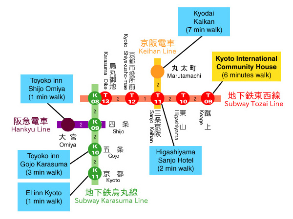 It is noted that the name of station K09 is "Karasuma" in Hankyuu-line and "Shijo" in Subway Karasuma-line. It is also noted that the stations K08 and T13 is the same station whose name is "Karasuma-Oike".