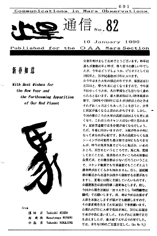 10 Years Ago (53) (Japanese)『火星通信』#082は編集諸氏の午年新年の挨拶で始まっている。そして、来る初冬の中接近に向けての準備と心構えが説かれている。また、次期からは報告用紙サイズを変更する旨を通知して新形式での報告を要請している。