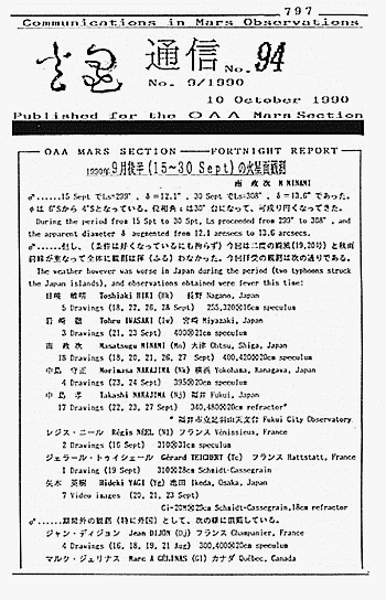 この号には、OAA MARS SECTIONから二つの記事がある。始めの記事は「NEWS?/浅田正氏」で浅田氏の許へCompuserveを通じてJeff BEISH氏から入った塵雲のアラートで、「ALPOのメンバーがEos辺りに、3,4,5 Octとdust cloudを観測したが、6 Octには治まっていた。」という内容である。あとの記事は「お知らせ/中島孝氏」で、浅田正氏がこの翌年にアメリカ留学する事が決まったので、浅田氏が受け持っていた『火星通信』事務局の業務を漸次縮小していくとのお知らせである。