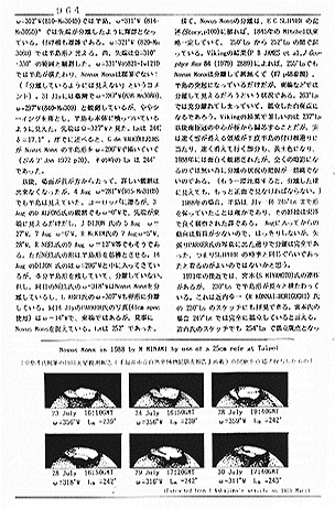 10 Years Ago (75) (Japanese)次いで、1991 OAA Mars Section NOTE (2)として「320゚Ls〜330゚Ls にかけての朝霧 "Morning mist from 320゚Ls to 330゚Ls in 1990"」があり、1988年の280゚Lsの前後にThaumasia Flixに観測された強い朝霧(#108 p930)の、1990年度に於ける追跡と比較の記事である。1988年度よりは少し季節が進んでいるが、1990年10月に入って視直径が15秒角を超えて大きくなってきた頃に320゚Lsに達していた。以降、11月上旬にかけて集まった観測の中から、該当地域も含めてSolis L、Syrtis Mjなどの朝霧の様子を取り上げた。しかし、1988年に観測されたような著しい朝霧は観測されなかった、というネガティブな結果となった。