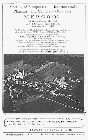 他にドイツで開催が決定した "MEPCO '92" (Meeting of European (and International) Planetary and Cometary Observers)の案内と会場の写真が入ったコピーが裏表紙一面に掲載された。後に判ったことだが、これにはクアッラ(G QUARRA)さんが参加されたそうである。