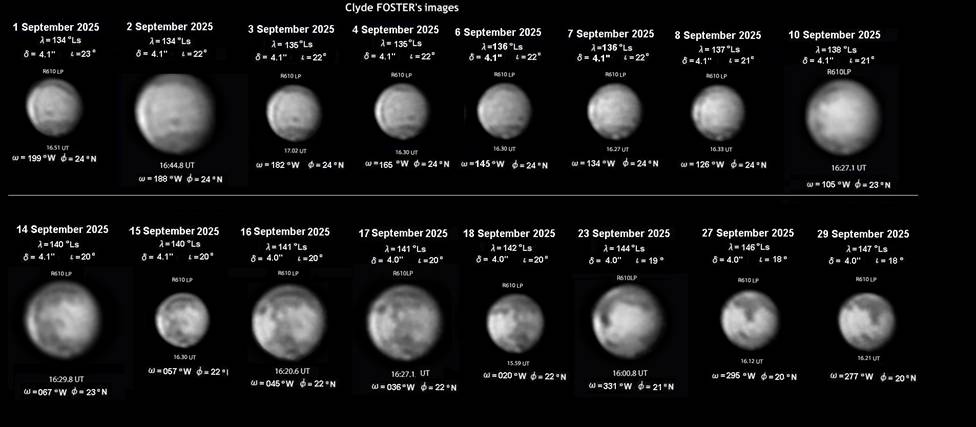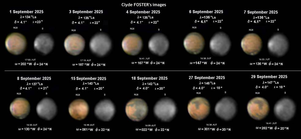 九月には報告者は、アフリカのフォスター氏だけといっても良い状況になった。アメリカ側からはウイルソン氏より月初めの1観測だけで、フォスター氏からの19観測と合わせて、合計では2名から20観測であった。フォスター氏は日没前からの撮影になっていて、月末の日没時の火星の地平高度は30度ほどと、まだ高さはあった。