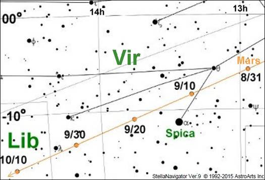♂・・・・・・ 今回も『火星通信』に送られてきた九月中の火星画像より、今期十九回目のレポートをまとめる。下図のように、火星は九月には「おとめ座」を赤緯を下げながら順行していった。スピカの北を12日に通過して、赤緯が10゚Sに下がったのは16日のことであった。