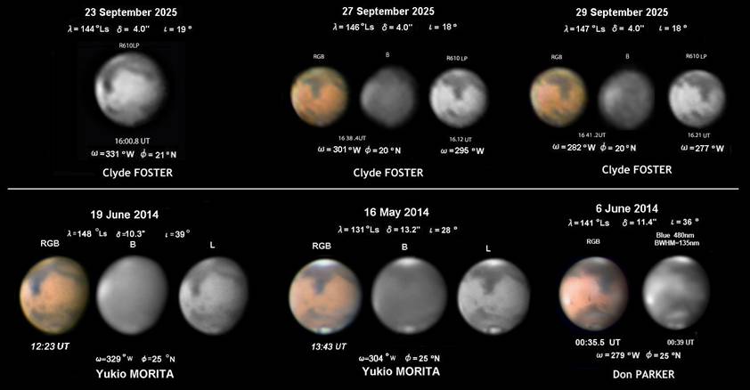 ヘッラスの夕方・昼間・朝方の様子を捉えた画像を並べて示す。下段は視直径が大きな2014年の、季節(λ)の近い画像を中央緯度(ω)をそろえて、比較のために並べた。傾き(φ)も同様であった。八月には朝方でのヘッラスの明るさは、あまり感じられなかったが、九月の下旬には明るさが感じられる様になっている。下段の画像はサイズを小さくしていることをお断りしておく。