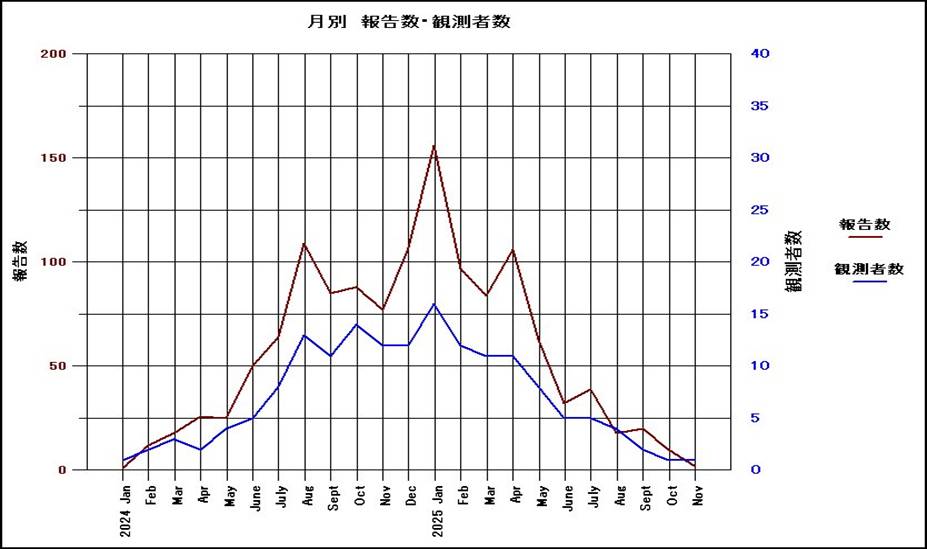 次には、月別の観測者数と報告数の変化のグラフを示す。