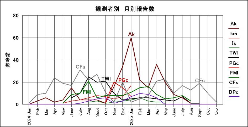 次には、観測者別の今接近期の月別の観測報告数を示す。