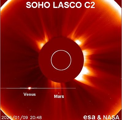 今接近での、火星と太陽との黄経の「合」は、一月9日のことで、「外合」に向かっている金星も同じ写野に入っている。火星は朝方の空に移り、来年二月の小接近に向け、順行を続ける。