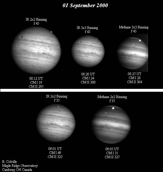@ . . . . I have attached a set of IR and Methane images taken 01 September 2000. At the beginning of the session, I was experimenting with an AO setup which yielded a rather high focal ratio (f45), and the resulting image was very close to the edge of the CCD chip. I took a sequence through the IR filter in both 2x2 and 3x3 binned modes. A good amount of detail was visible, and the shorter exposures in the 3x3 binned mode appear the sharpest. The methane image was taken in the 3x3 binned mode due to the very long exposures needed.